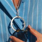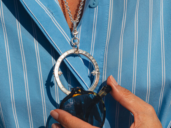 Der Ring-Anhänger ist einer von drei verschiedenen Designs. Er kann als reines Schmuckstück dienen, als auch funktional zum Einhängen der Brille. Die Oberfläche dieses Modells ist glatt, kann aber nach Wunsch individuell mit Text oder Symbolen gestaltet werden.
