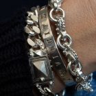 Massive abgekantete Panzerkette mit einer Schließe im typischen Muff-Design mit Nieten und Dots.