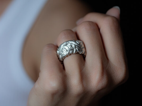 Dieser Ring ist einer von 4 Modellen bombierter Bandringe. Die Kleinserie besticht durch die Massivität und tiefe, markante Gravur.