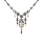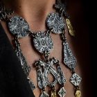 Inspiriert von nordafrikanischem Schmuck, insbesondere dem Schmuck der Tuaregs ist 2016 eine ganze Kollektion namens AFRO entstanden. Sie umfasst Anhänger, archaische Ringe, Ohrringe und Ketten. Für dieses Unikat wurden einzelne Elemente zu einem Collier zusammengefügt. Das bicolore Materialspiel von schwarz rhodiniertem Sterling Silber und 18-karätigen Gelbgoldelementen unterstreicht die orientalische Anmutung. Die fein ausgearbeiteten Strukturen der Flächen wurden im Siegel-Prozess angefertigt: Zunächst ins Wachs geschnitzt, dann in Metall gegossen und schließlich wiederum in weiches Wachs abgedrückt, so dass die gesiegelten Ornamente der Urform im Positiv entstehen…