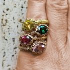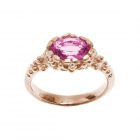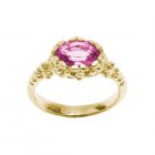 Zarter Solitärring mit quer ovaler Fassung aus 18 kt Gold mit einem rosafarbenen Turmalin. Muffs Formensprache gelingt ein Twist zwischen antiker Anmut und zeitloser Moderne.