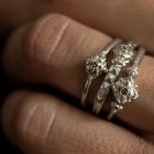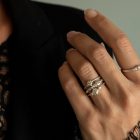 Superzarte Fassung mit einem feinweißen Brillanten (ca. 0,06 ct.) wahlweise in Gelb-, Rot- oder Weißgold gefasst. Carlotta heißen die zarten Solitärringe von Patrik Muff. Sie lassen sich untereinander gut kombinieren, da sich die Fassungen ideal ineinander schmiegen. Muffs signifikante Formensprache, die sich durch feine Details, kleine Nieten, Noppen und Dots, auszeichnet, gelingt ein Twist zwischen antiker Anmut und zeitloser Moderne.
