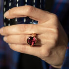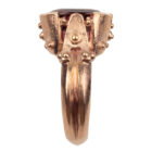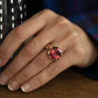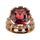 Ein pink-rosaroter Turmalin, Ceylon Schliff, umrahmt von einer eigens dafür angefertigten Rotgold Fassung aus 18 kt Gold. (Leichte Farbabweichnungen können sich aufgrund der Bildschirmdarstellung ergeben). Abmessungen des Turmalins 13,7 x 13,9 mm.
