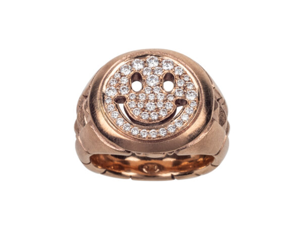 Der klassische Siegelring erhält seinen Twist durch die Darstellung eines Smileys mit durchbrochenen Linien statt eines Wappens.